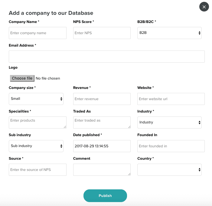 Adding your score and information is as easy as 1, 2, 3. Start by clicking the "Add Your Score" button on the NPSBenchmarks.com homepage. A pop up will appear where you can fill in all the relevant information about your company.