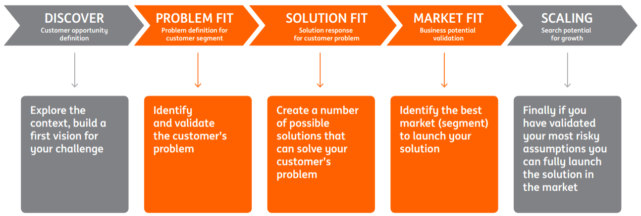 In Discover, an ING team finds a challenge, problem, or customer need to address. Considering Think Forward, it’s very possible this challenge will be identified by a customer. In Discover, a broader context for the challenge is found so that in the Problem Fit phase, a specific challenge can be identified, as well as what kind of customer is being affected. This allows ING to figure out if a problem is really worth pursuing or addressing, in seeing how many people are affected, and how it affects them. If the problem is found to be significant, it’s time to go to Solution Fit, or listing different potential solutions, and testing them out to see which one works best.