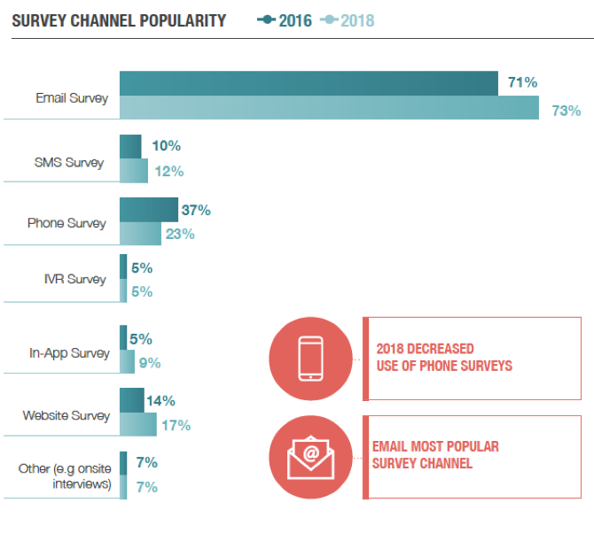 In our past research, we’ve also found that email is typically the chosen and most effective method for surveying—year over year. The reason why might be fairly simple: frequency. Survey emails tend to have a less invasive feel compared to other methods. Because of this, companies can up the frequency of surveys, leading to higher response rates and trackable trends quarter over quarter.