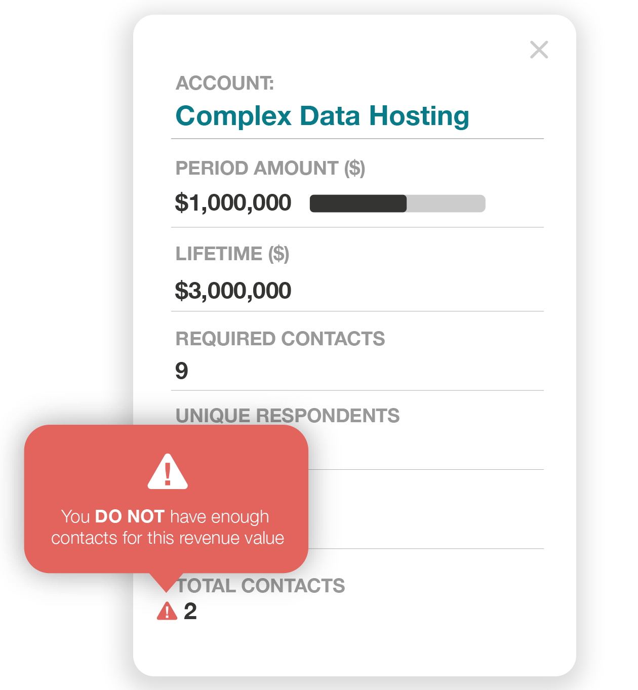 In the image to the right, you can see that the “Account Overview” tool has highlighted that Complex Data Hosting, a high-value account, worth $1 million, has only two contacts associated with it. Drilling down into the details would show that these two contacts represent operational users only. Hence, the key stakeholders that may impact the bottom line the most—influencers and decision-makers—have been left behind, and unsurveyed. That’s a high-value account at risk!