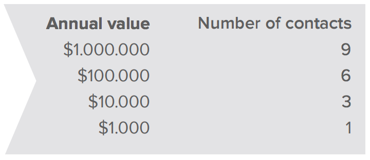 Based on our years of research across industries, our short answer is it depends on the revenue and nature of your account. Logically, bigger accounts will have a higher number of contacts. But, as a rule of thumb, we recommend using the 3 x 3 model, or three contacts at each level for a million-dollar account. In a million-dollar account, for example, there are often at least 9 people involved in new purchase decisions; in hundred-thousand-dollar accounts, that number is closer to 6.