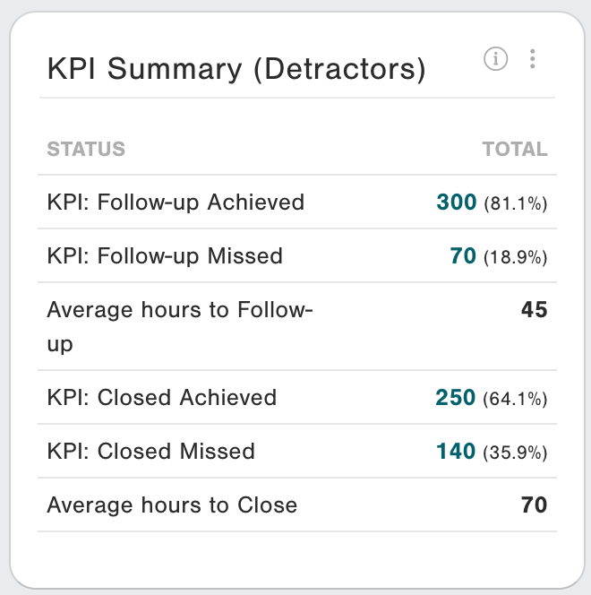 - KPI Summary: If an organisation has a target for closing the loop with customers within a certain period of time— for example, “Follow-up with Detractors within 48 Hours”— this information is important for teams to be aware of and be able to track on their dashboard. In CustomerGauge, teams can use the KPI Summary reporting capability to track if they are achieving the set KPIs, know what percentage of the KPI they hit (and missed), and see the average time taken to follow-up on or close cases.