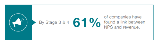 According to our most recent benchmark survey, by stage 3&4 (Monetize and Grow), 61% of companies have found a link between NPS and revenue. Many companies only look at NPS and total revenue, but the task is to establish the link between NPS and customer loyalty growth factors like retention rates, referral sales rates and up-/cross sales rates.