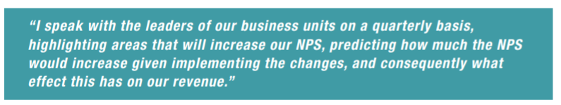 For example: “If we increase our percentage of promoters by 5%, profits will increase by 10%. We can tell this because promoters are 15x more likely to buy more than passives or detractors.”