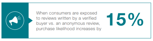 As previously mentioned, companies that display reviews for products or services typically see an average sales increase of 270%. Based on the same Northwestern University study, “purchase likelihood increases 15% when consumers are exposed to reviews written by a verified buyer vs. an anonymous review.”